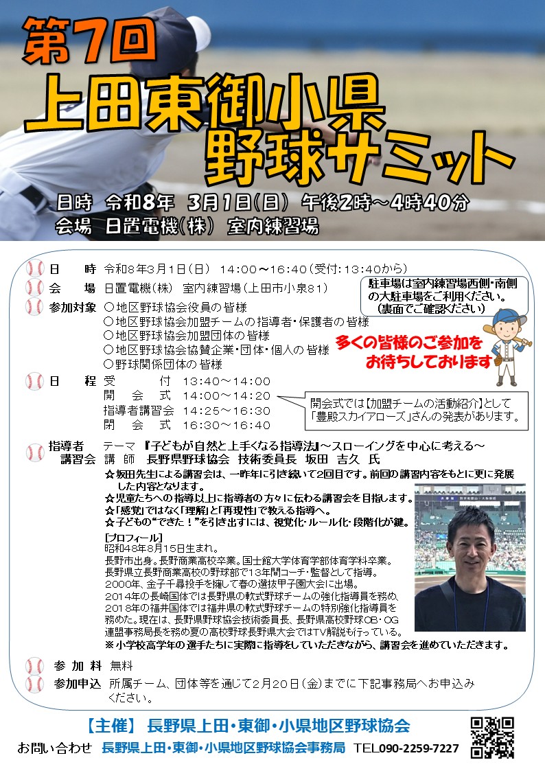 野球を中心に、さらに様々な活動により、心身を育み、たくさんの友達をつくって、共に楽しく充実した時間を過ごしましょう! | 代表 小林 勝 0268-63-7359 |